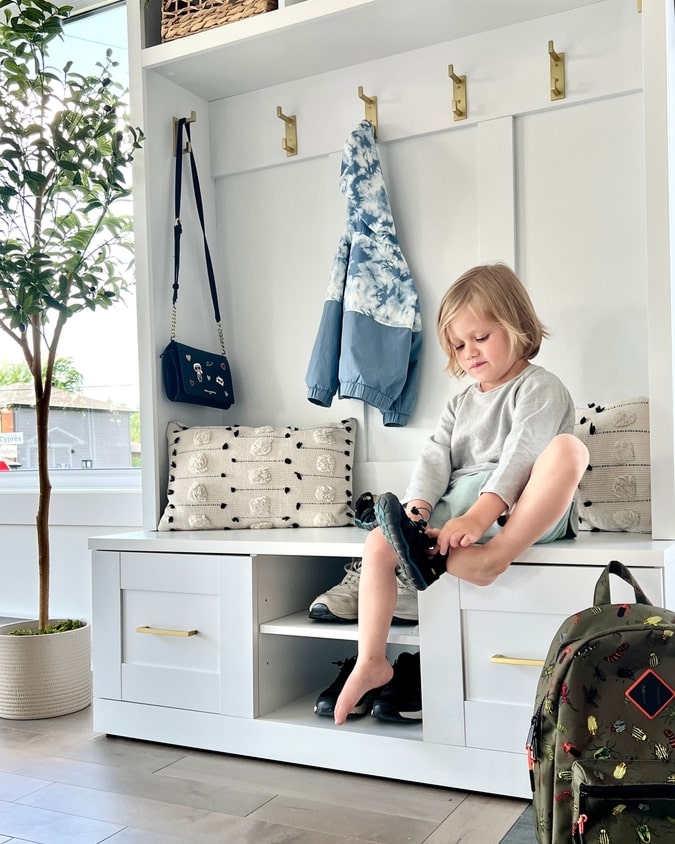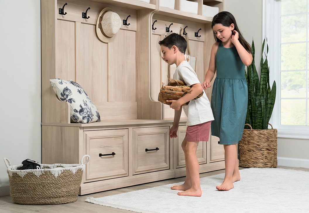 Start every day in a clutter-free space. Our hall trees, bookcases, and cabinets include built-in wall anchors for added stability — keeping your home organized and secure.