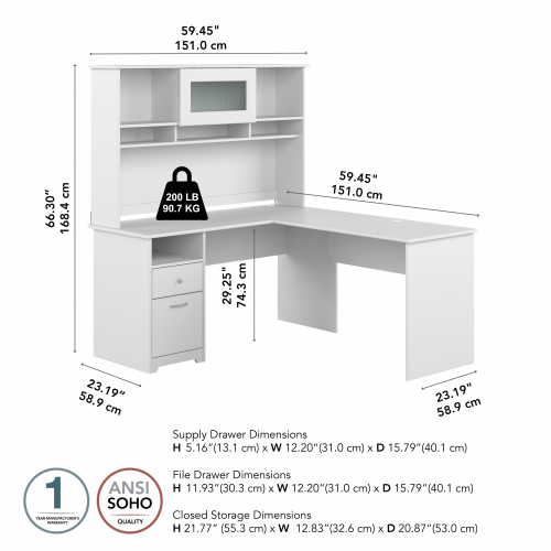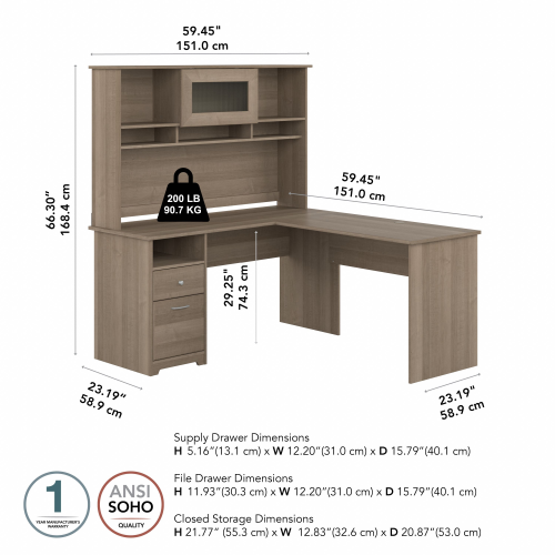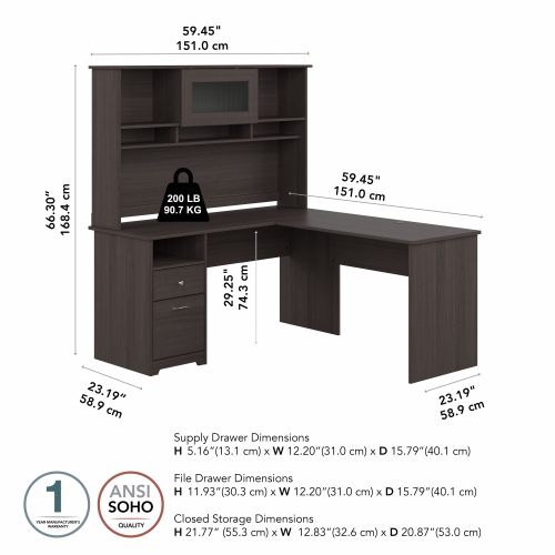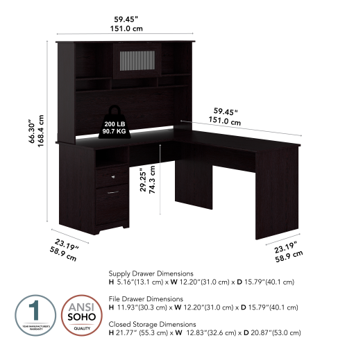 Cabot 60W L Shaped Computer Desk with Hutch and Drawers
