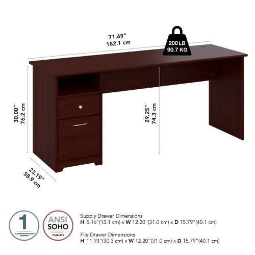 The Bush Furniture Cabot 72W Computer Desk with Drawers presents a home office solution with transitional style. Take advantage of the 72-inch desk surface to spread out with a computer, books, and all the materials you need to power through your next project or assignment. The durable desktop supports up to 200 pounds and includes built-in wire management to keep...