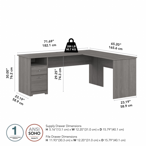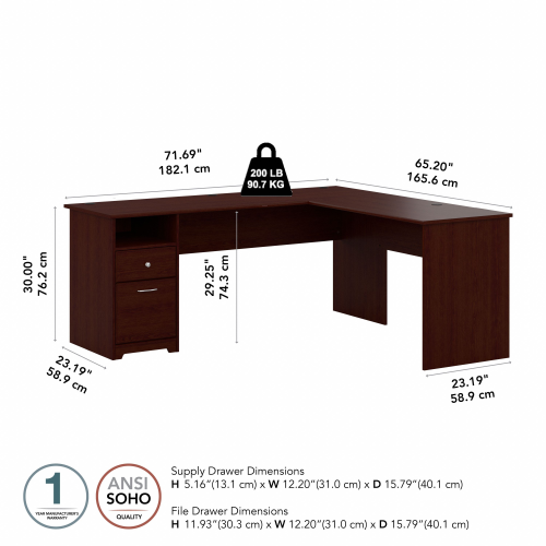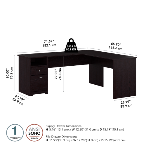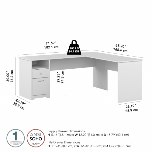 The Bush Furniture Cabot 72W L Shaped Computer Desk with Drawers presents a home office solution with transitional style. Take advantage of the spacious 72-inch L Shaped Desk surface to spread out with a computer, books, and all the materials you need to power through your next project or assignment. The durable desktop supports up to 200 pounds and includes...